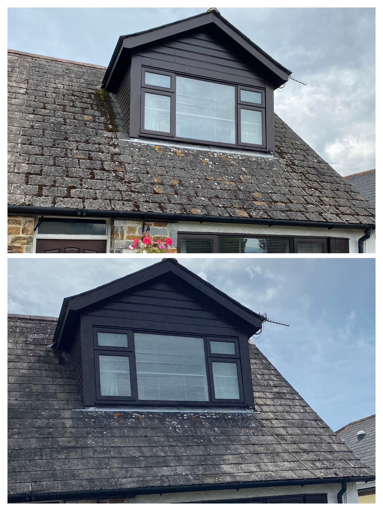 Roof moss removal completed from ground level using extendable poles and gentle roof scraping. All debris removed will be cleaned away and gutter emptied as standard with this service.